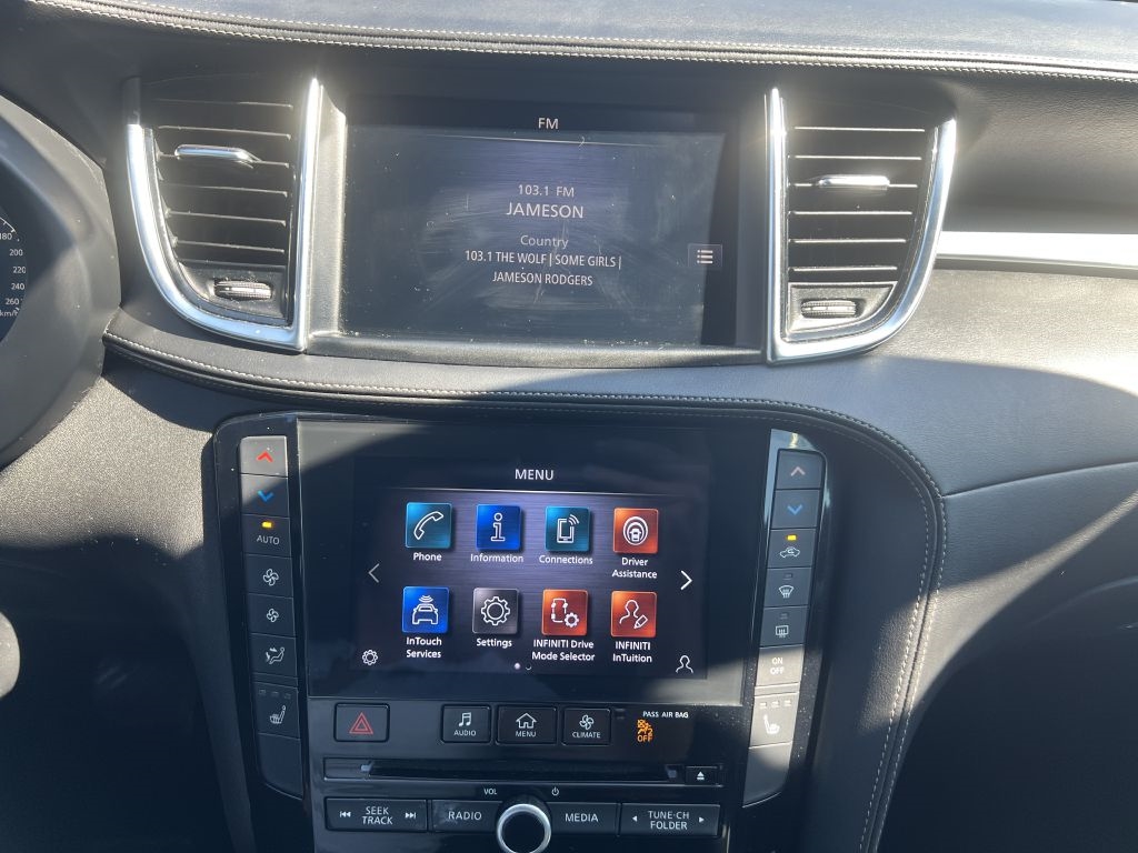 • Radio: AM/FM/CD Audio System -inc: 6 speakers, 4 USB connection ports, Apple CarPlay and Android Auto, dual display system w/upper 8" and lower 7" HD touch screens, INFINITI voice recognition, HD Radio technology, SiriusXM radio w/advanced audio features w/3-month complimentary trial, streaming audio via Bluetooth, Bluetooth hands-free phone system, Siri eyes free, hands-free text messaging assistant, active noise cancellation, WiFi hotspot, automatic collision notification and emergency call